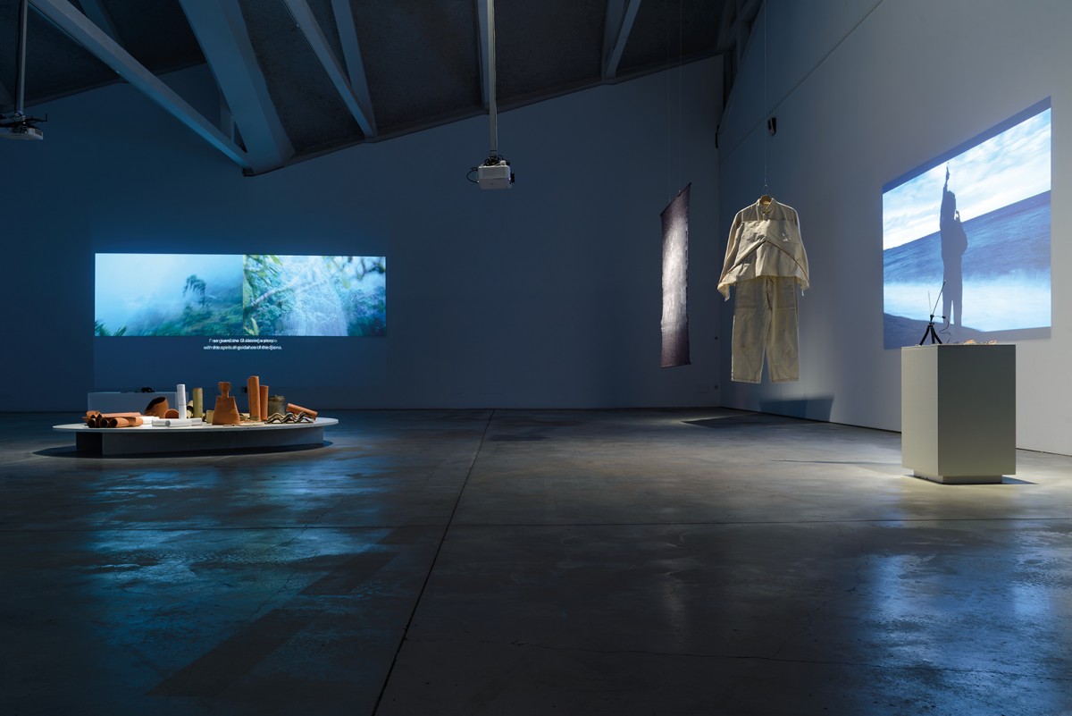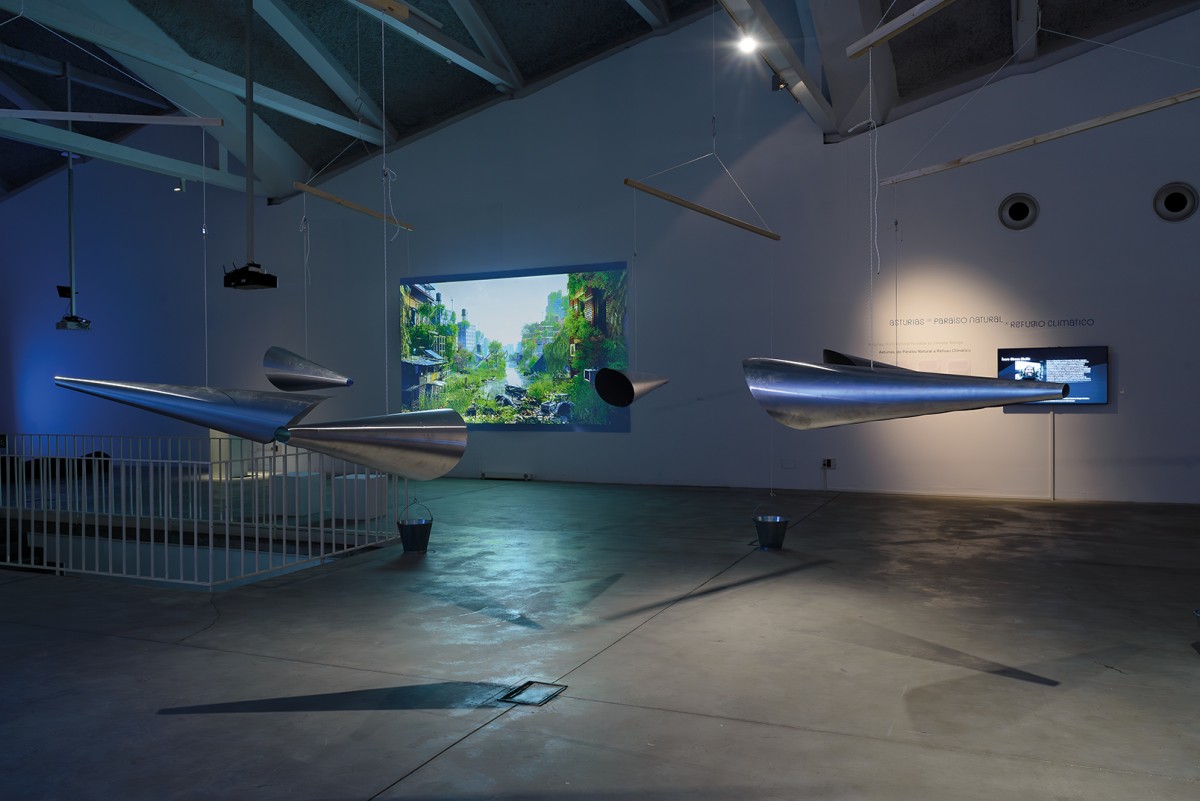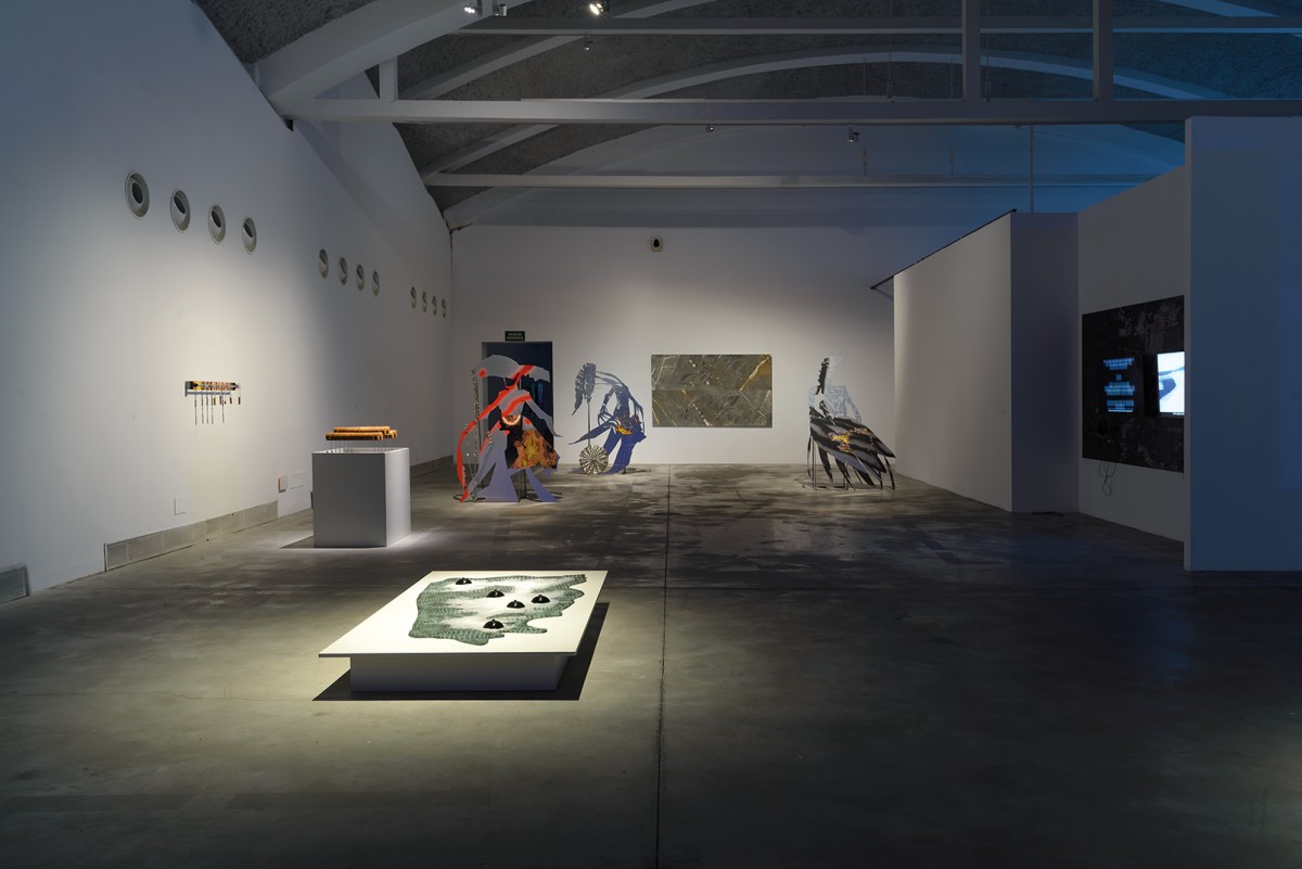 Installation view: Afroditi Psarra & Audrey Briot, Listening Space, 2019, Paky Vlassopoulou, To Love the Hibiscus, You Must First Love the Monsoon, 2022, Felipe Castelblanco, Rio Arriba, 2020 (photo by D. Aguilar Sanchez)