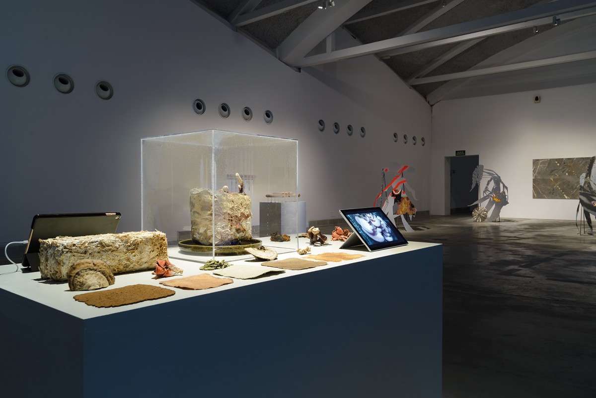 Installation view: Matthias Fritsch, Mycelium Garden, 2023, Lito Kattou, Bodies X-XV, 2022, Petros Moris, Anagram, 2022 (photo by D. Aguilar Sanchez)