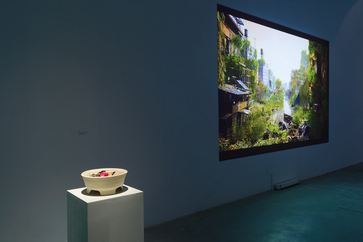 Installation view: Kat Austen, Time to Break Down (Echoes of the Palaeo-plasZcene), 2021, Superflux, Refuge for Resurgence- Window View, 2021 (photo by D. Aguilar Sancez)