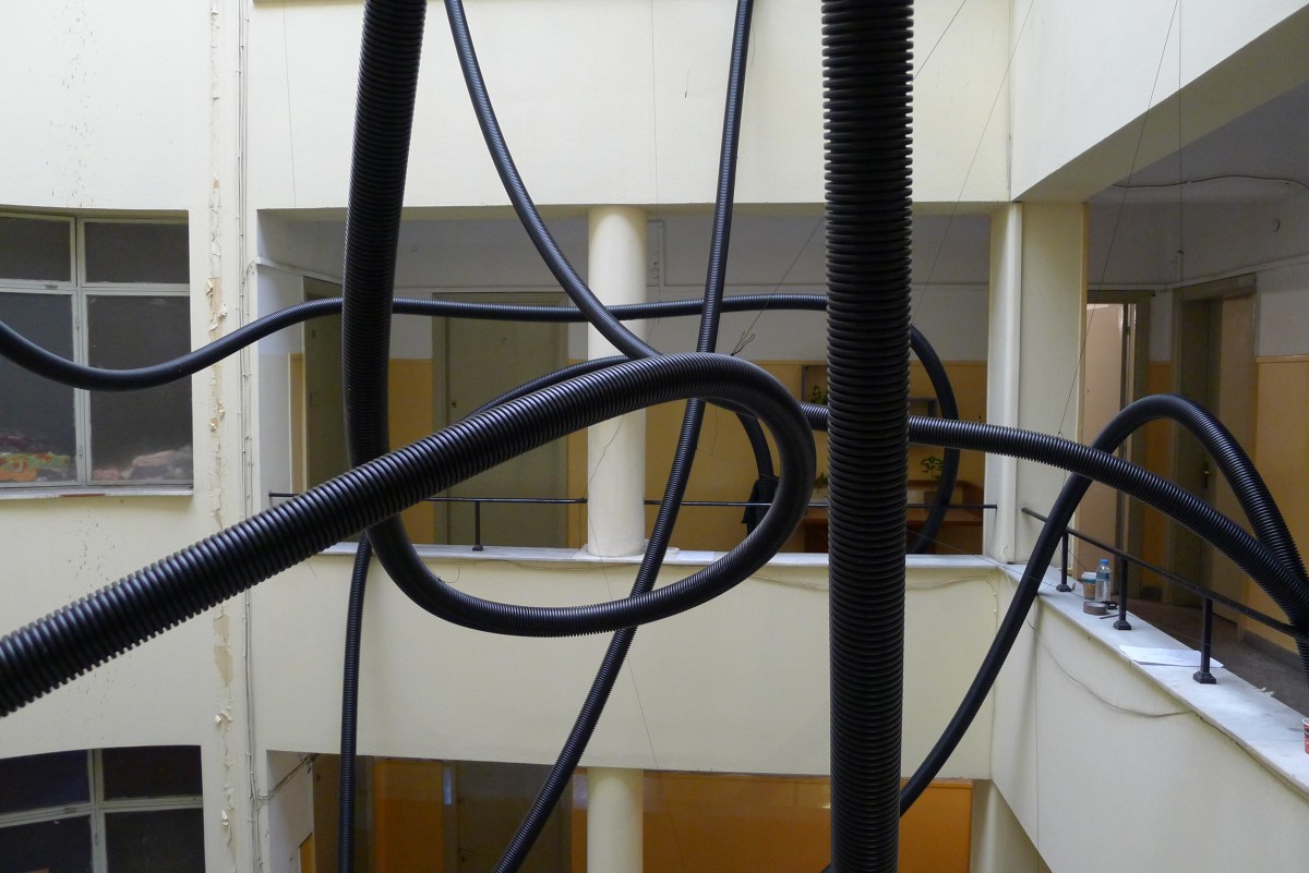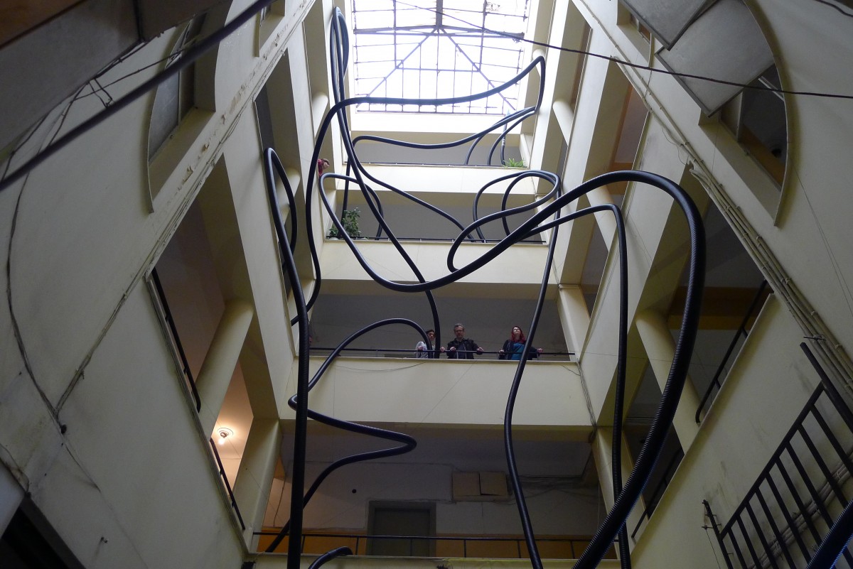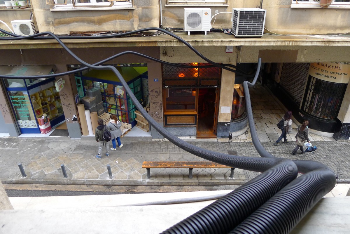 The project New Babylon Revisited invited to Athens artists and theorists who through their workshops and actions proposed new architectures of connectivity and re-examined the city’s infrastructures. As part of the overall project, the studios and offices of a building in Praxitelous street was connected through a pneumatic network of tubes; a city drift invited visitors to a free exchange of files; a discussion around the enclosures of the Athenian commons was hosted in an offline sharing network; a parasitic micro-conference on the move re-approached Athens and an ephemeral radio station at Mavromichali street ran as an open and accessible network, addressing a call for discussions and actions.