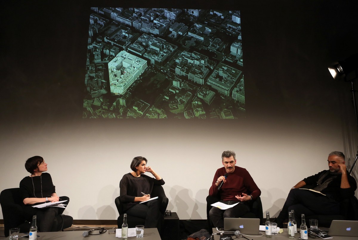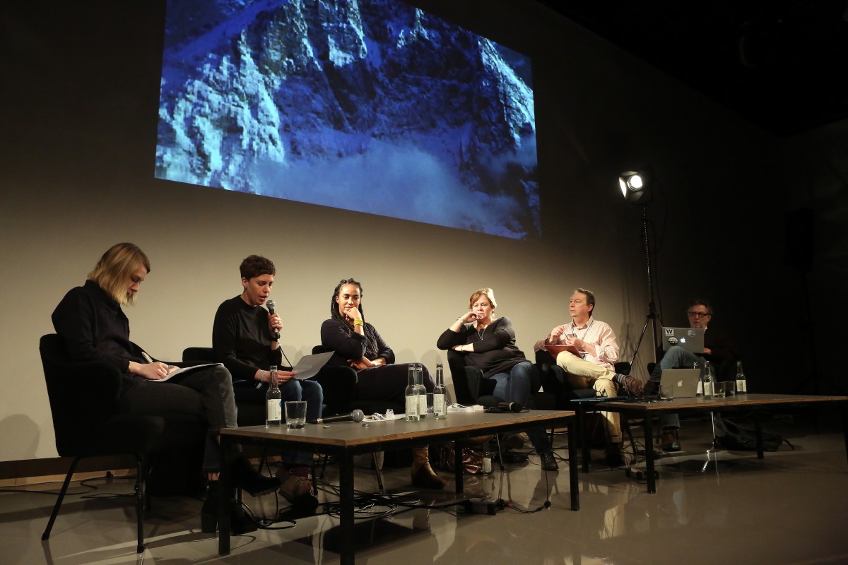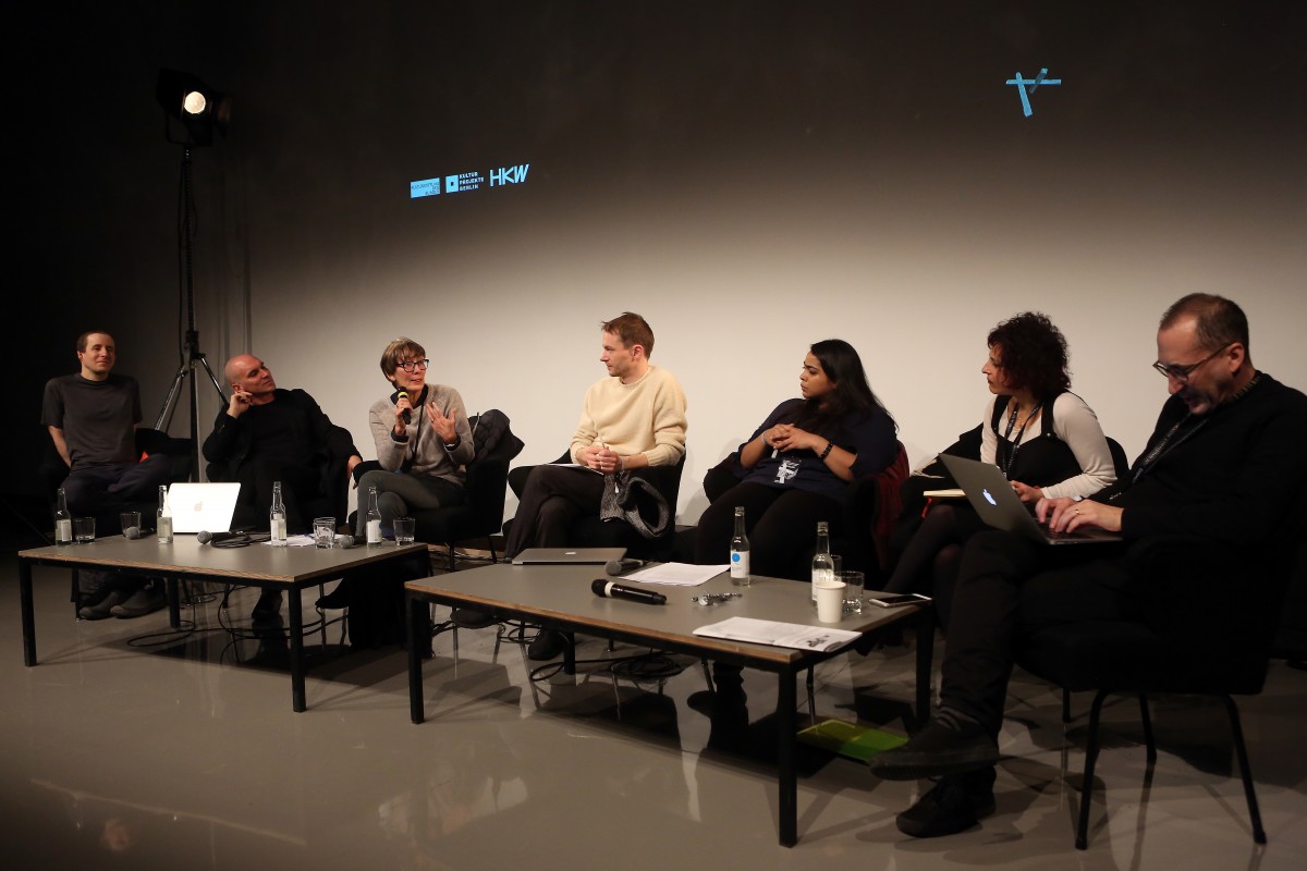 Josh Berson, Matteo Pasquinelli, Marie-Luise Angerer, Sascha Pohflepp, Nora N. Khan, Orit Halpern and Chris Salter (left to right) at "Middle Session: The Alien Middle". Adam Berry, CC BY-SA 4.0